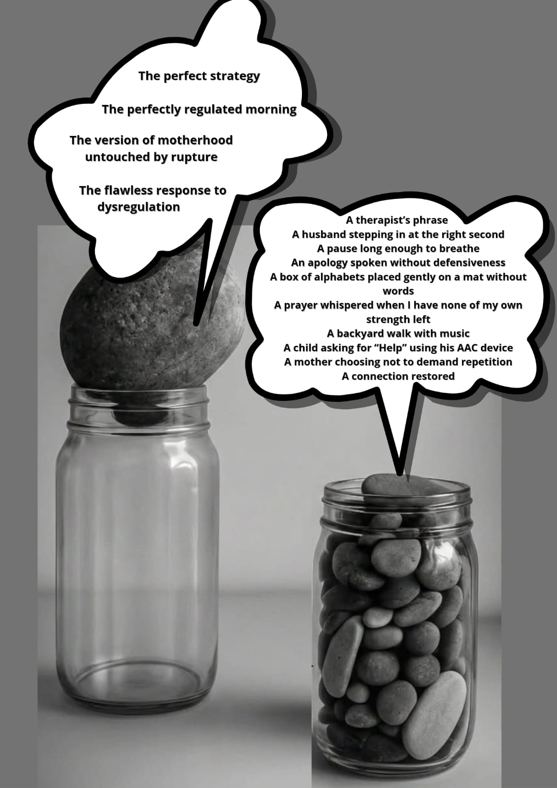 I picture that jar with the enormous stone balanced on its rim, too large to enter. It represents the flawless morning or the motherhood untouched by rupture. But the jar doesn't fill that way. This is a record of repair—of what happens when grace meets us not in perfection, but in honesty.