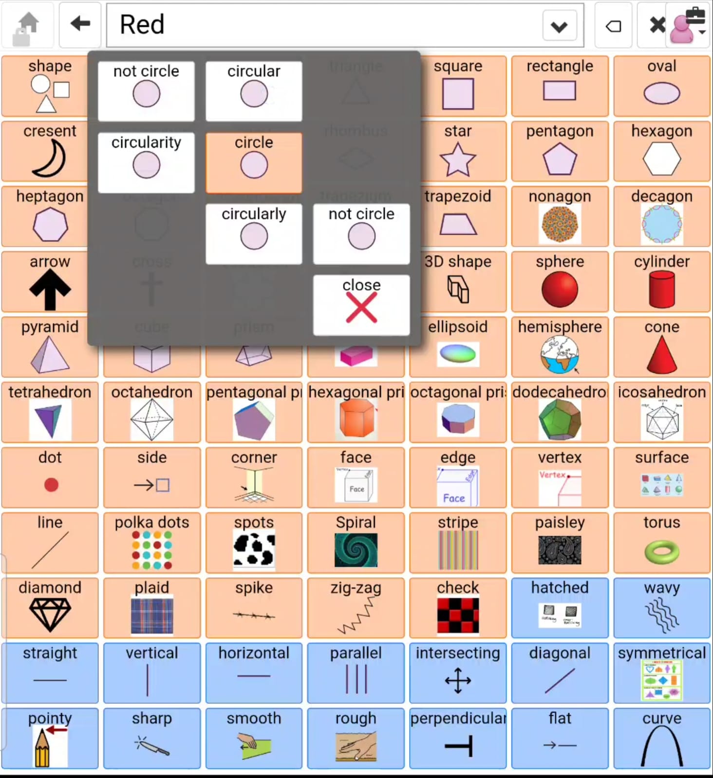 - Then I open the Shapes folder and long-press circle to explore related word forms, and choose CIRCULAR.